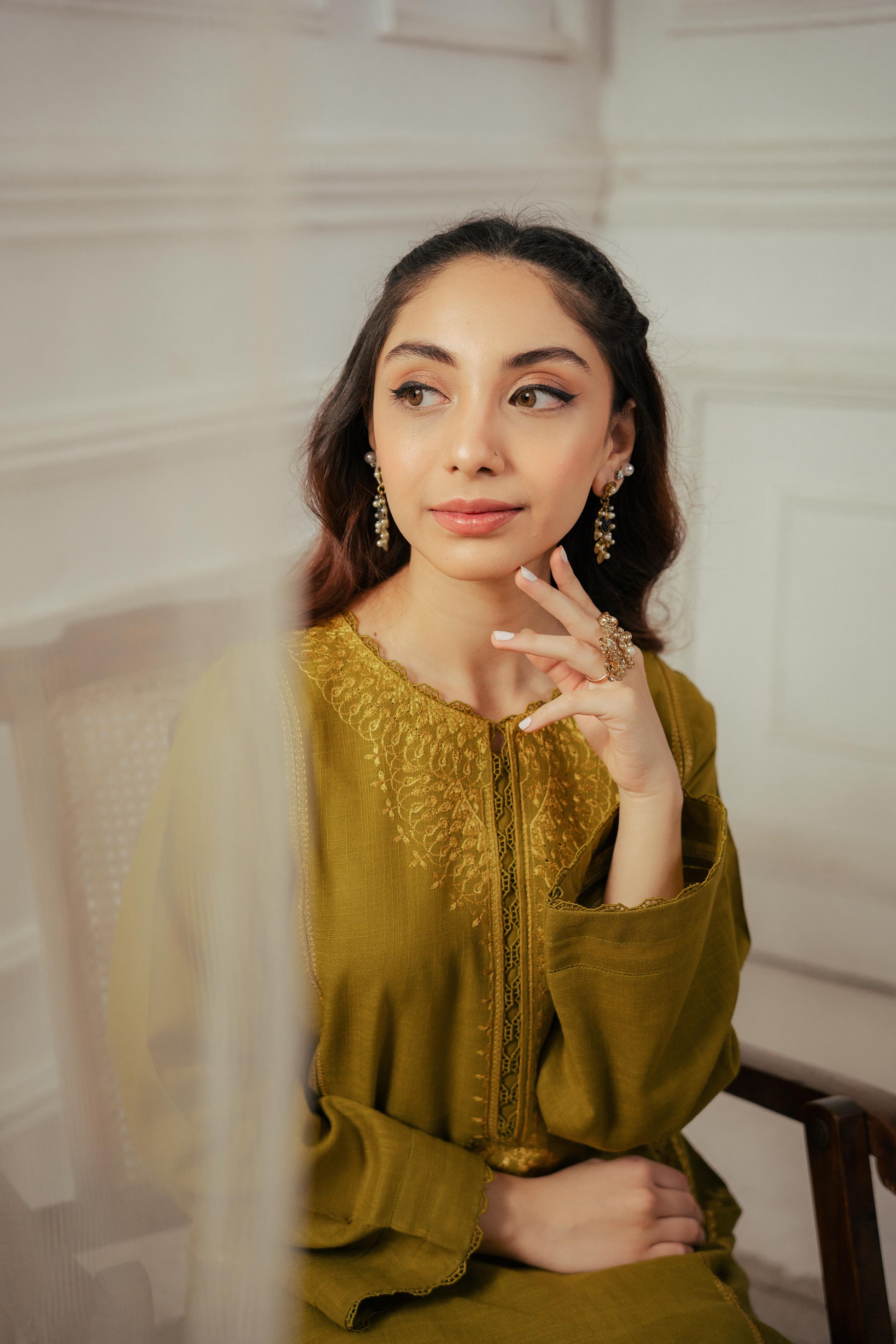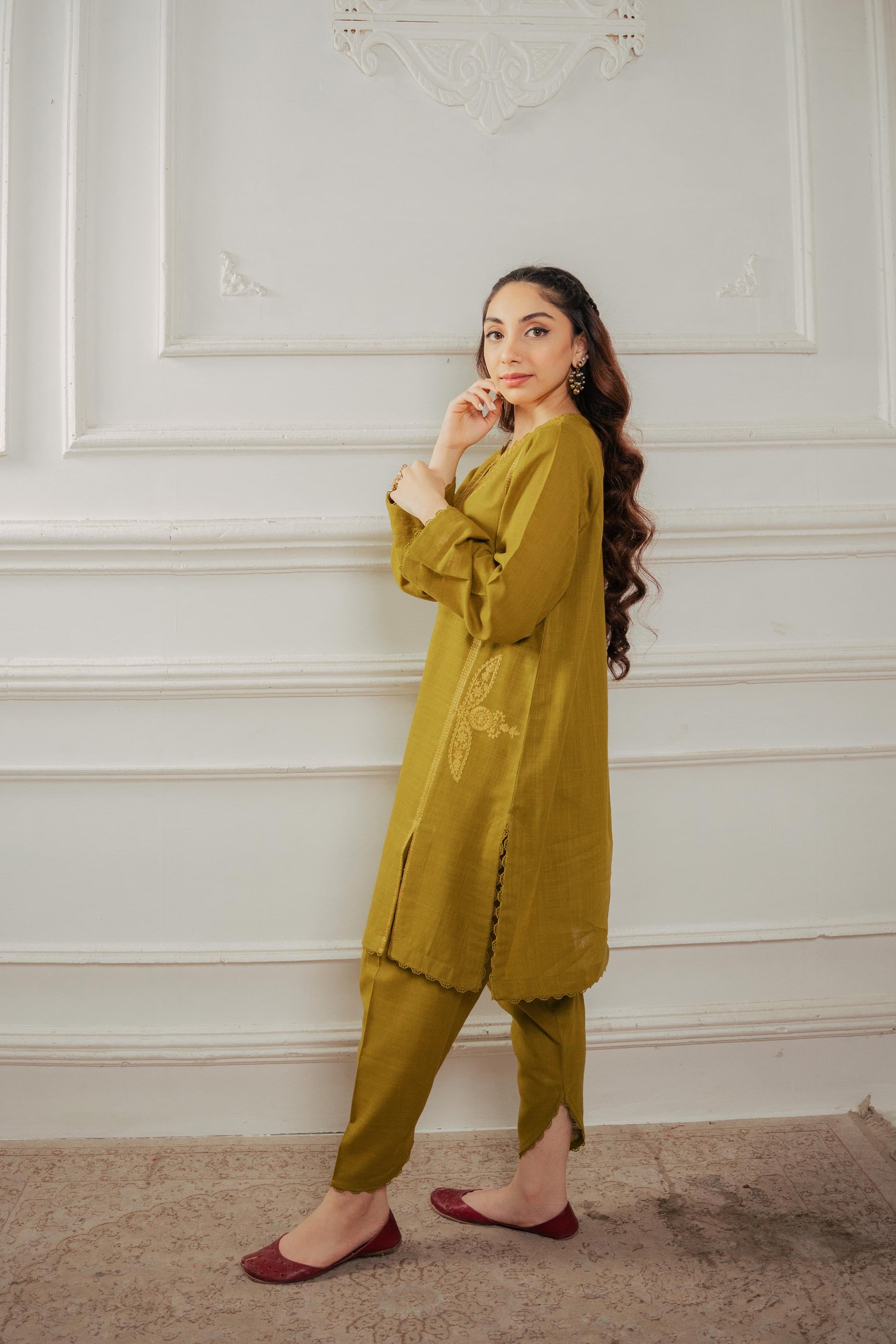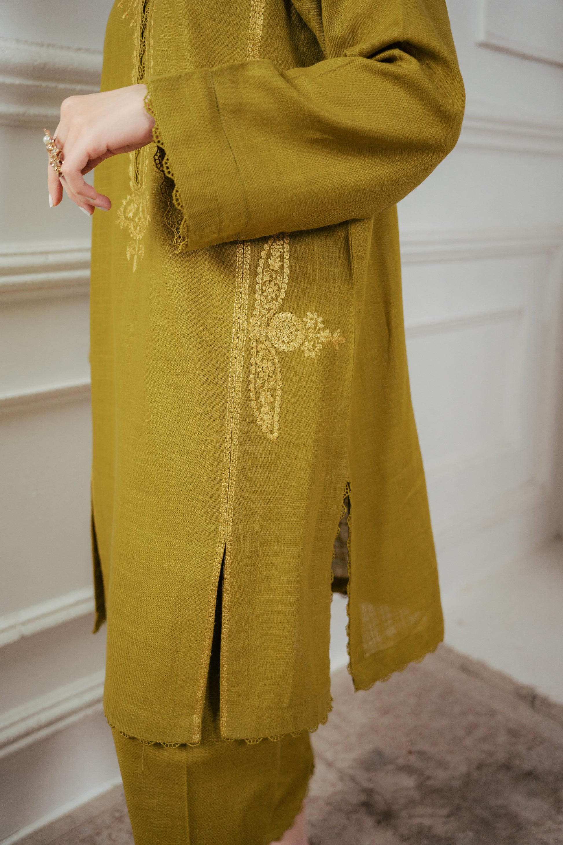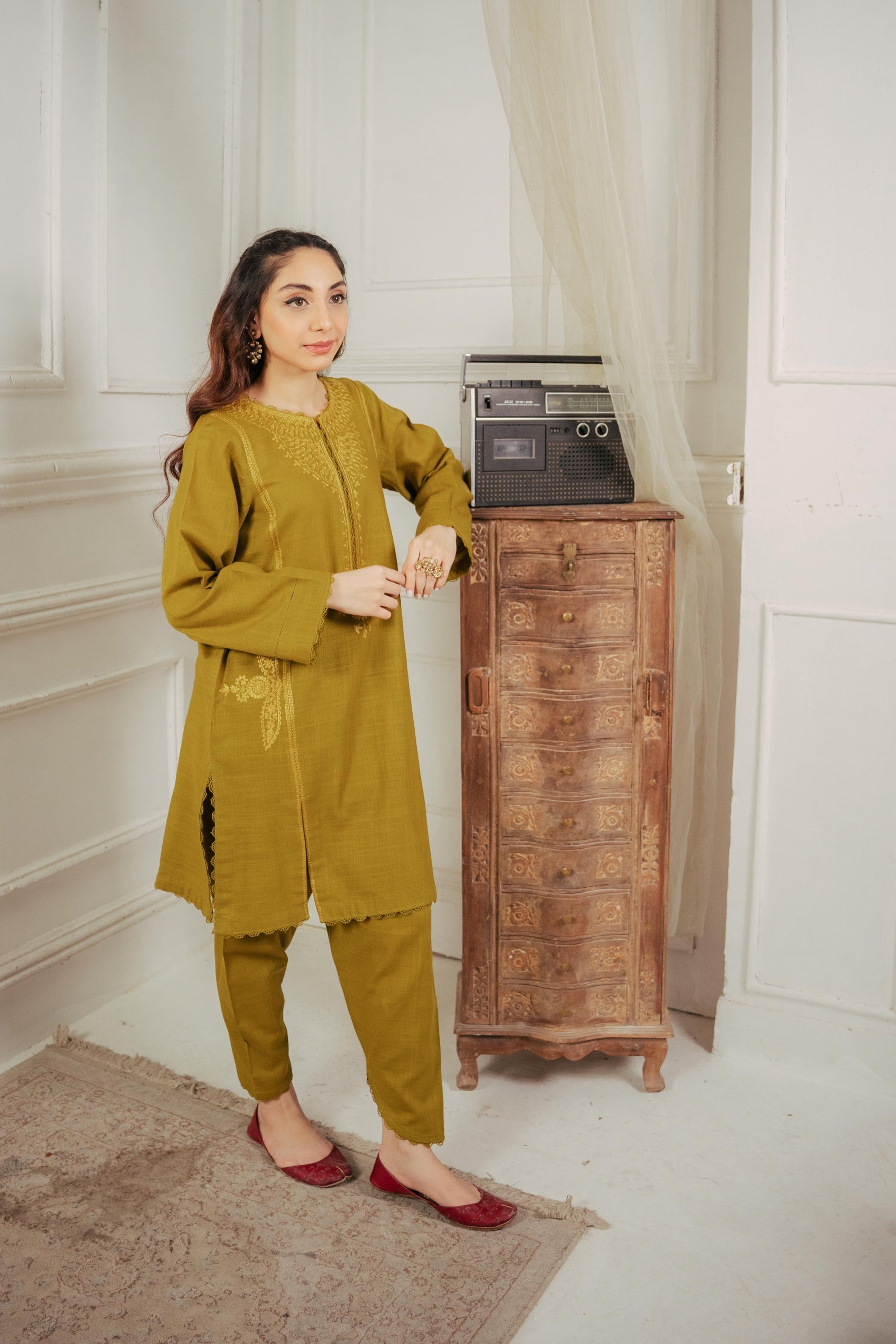 Winter demands vibrant hues and sophisticated styles. A flawless outfit for women that is bound to capture attention: a gracefully crafted shirt adorned with intricate details on the neckline, front, and shalwar.