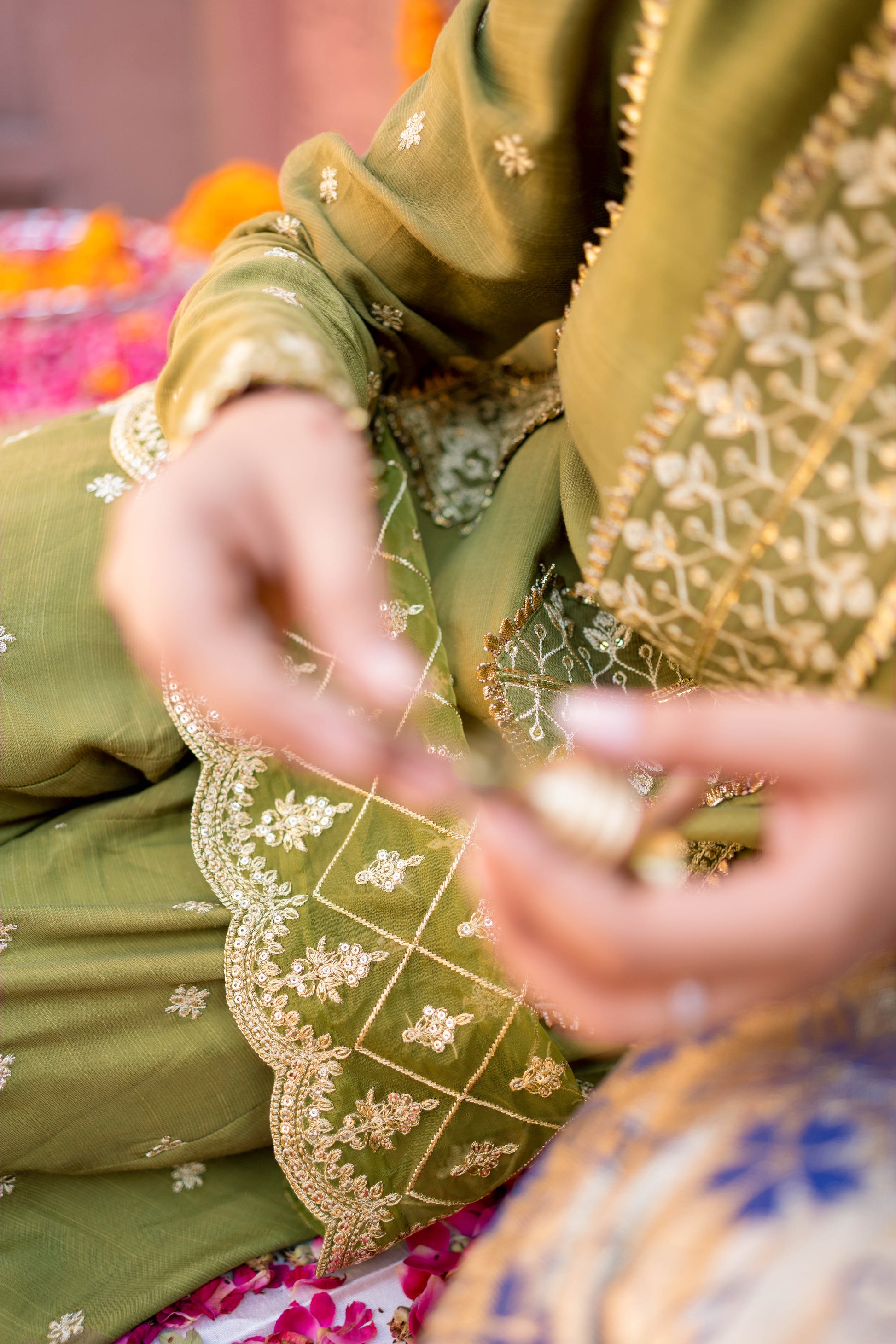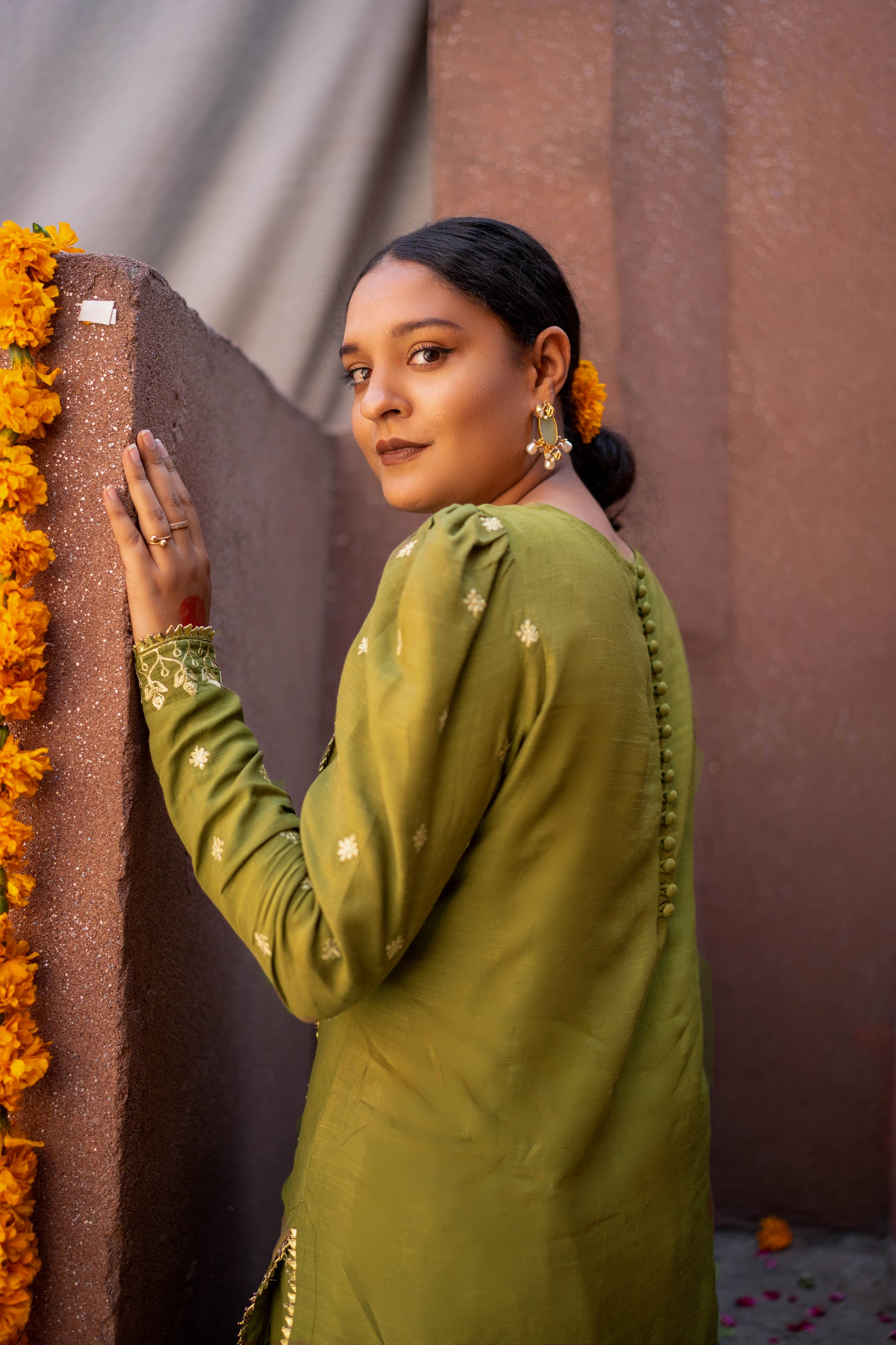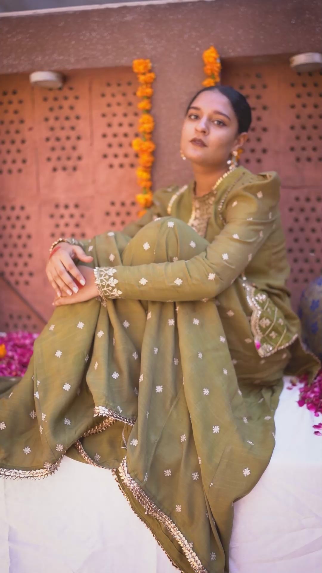 MAHNAZ is a sharara outfit. sharara with puffed sleeves short shirt and organza dupatta. Outfit fabric is pk raw silk embelished with gold tilla embroidery and sequins, stitched in traditional way, finished with gotta lace. Dupatta is organza finished with kiran lace.