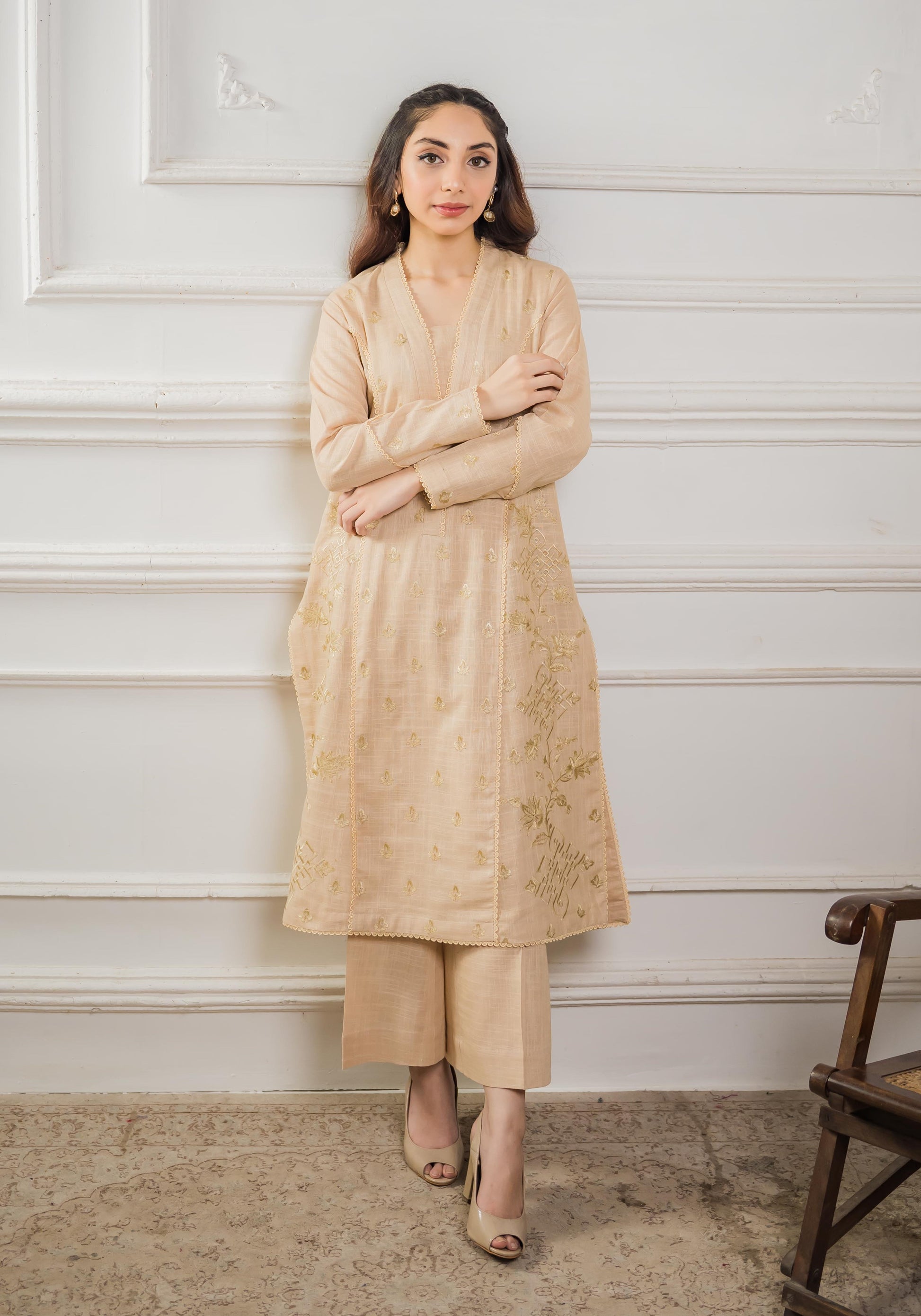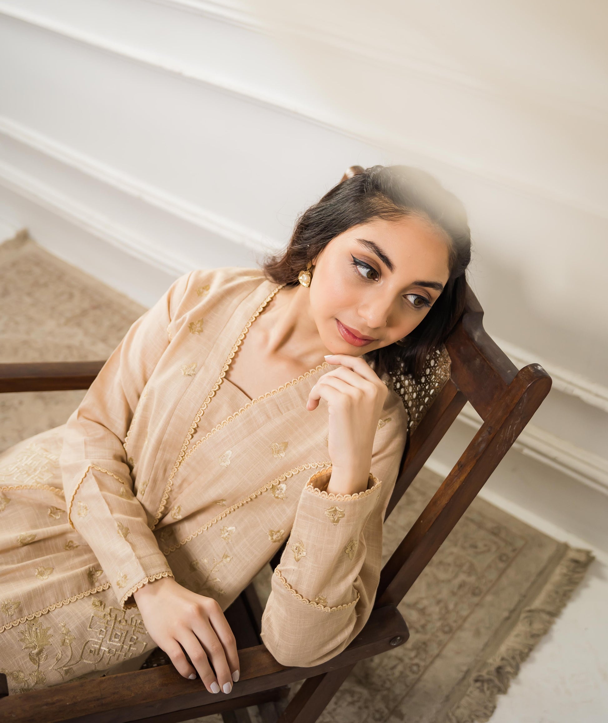 Introducing a sophisticated mood for pesto enthusiasts – a professionally layered, sleek style with exquisite details. Transforming beige with hints of ivory fabric into a contemporary kurta paired with culottes, it's the all-in-one ensemble designed for today's modern day women.